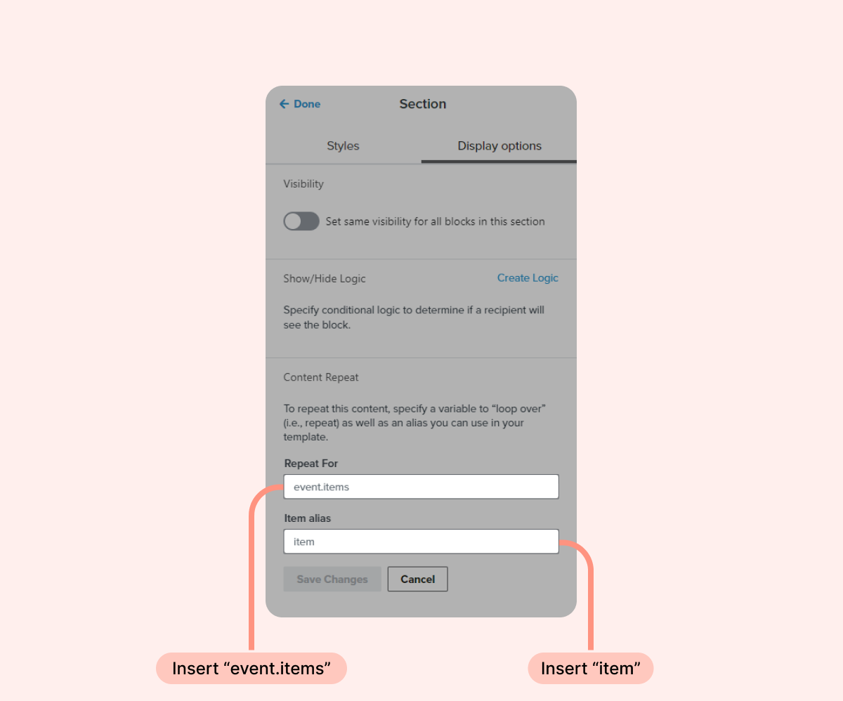 - Once the body of the email is written, add a new section block with content repeat rules using the following parameters: