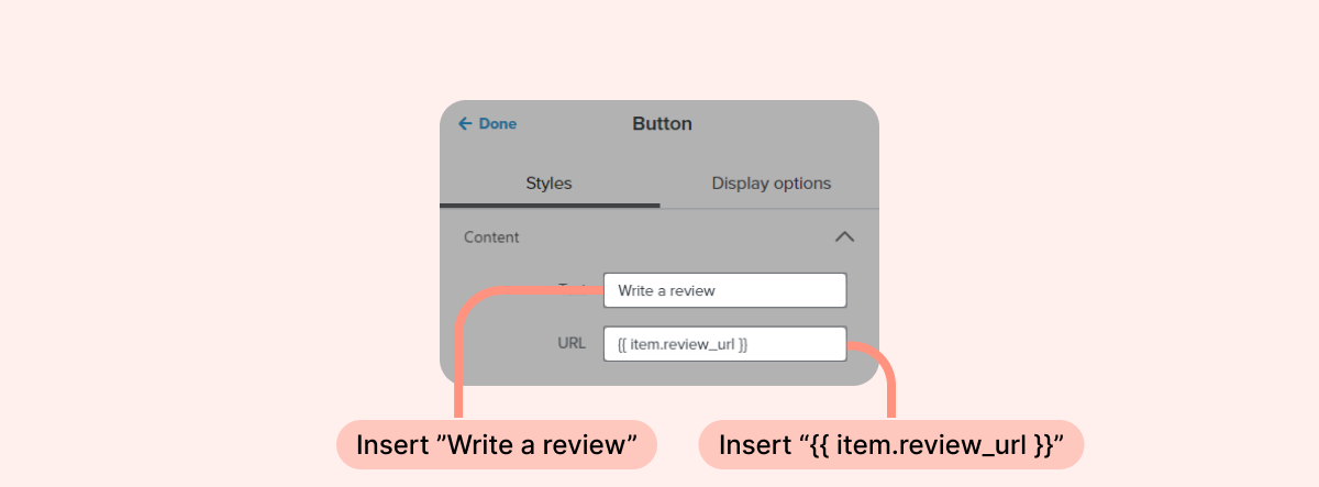 - To add a "Write a review" button that redirects your customers to the product's review form, add a "Button" block that uses the following Loox parameter: