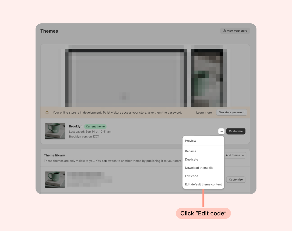 - Inside the Shopify Themes menu, click the “... ” button next to “Customize” and select "Edit code":