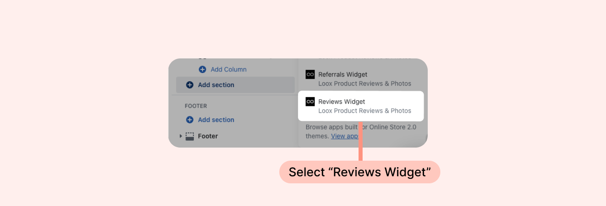 Inside the “Featured product” section of your homepage, click “Add block” and select “Reviews Widget”: