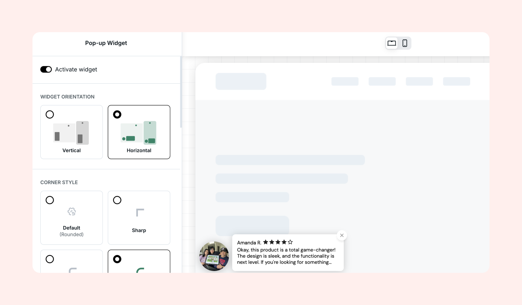 Once enabled, the Pop-up Widget will display a single review for a set number of seconds, one review at a time out of your entire collection of reviews.