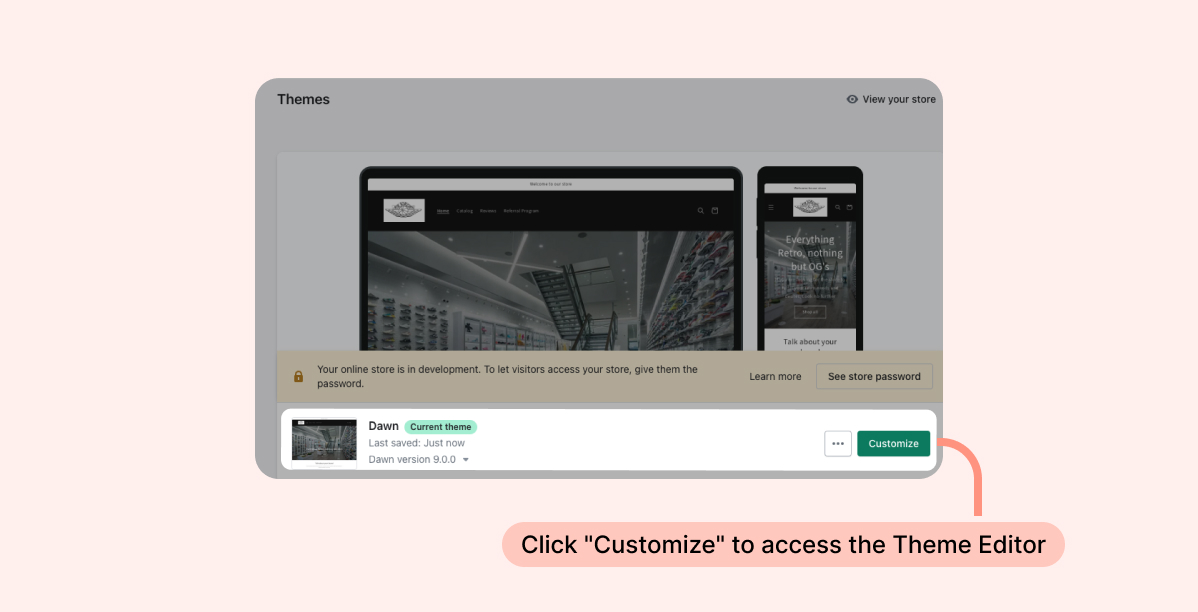 - Inside the Shopify Themes menu, click "Customize" to access the Theme Editor.
