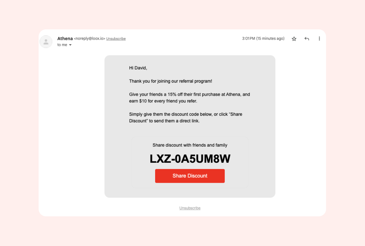Every customer who registers as a brand advocate using an Onsite Referrals Widget will receive an automatic email with their unique referral discount link to share with family and friends.