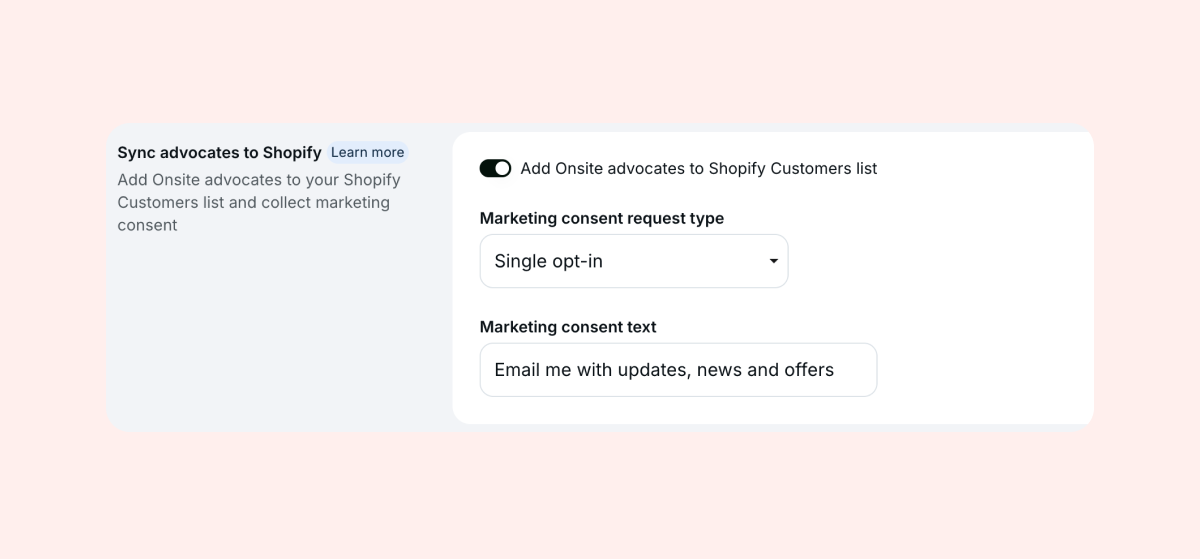 - Under “Sync advocates to Shopify,” enable "Add onsite advocates to customers list."