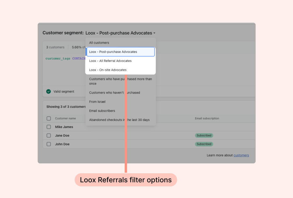 - Loox - Post-purchase Advocates: Shows all advocates who came through the Post-purchase Referrals Widget