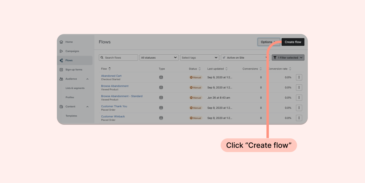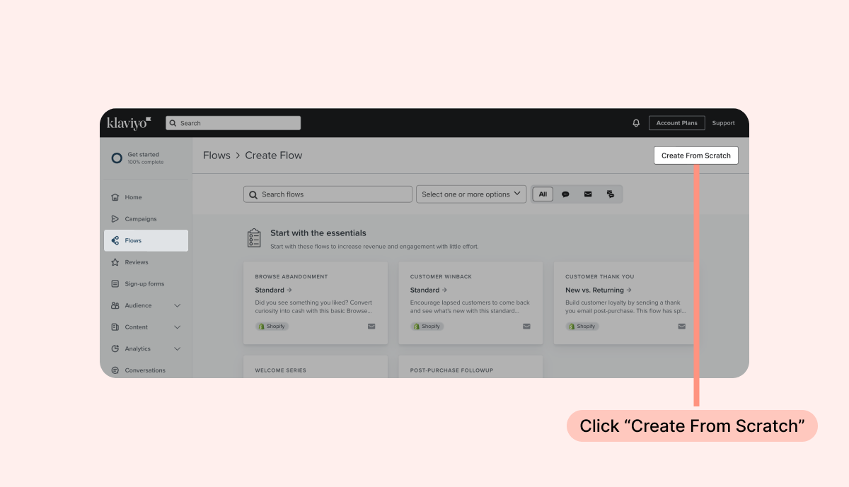 - Learn more about creating Flows on Klaviyo's help article: Getting Started with Flows.