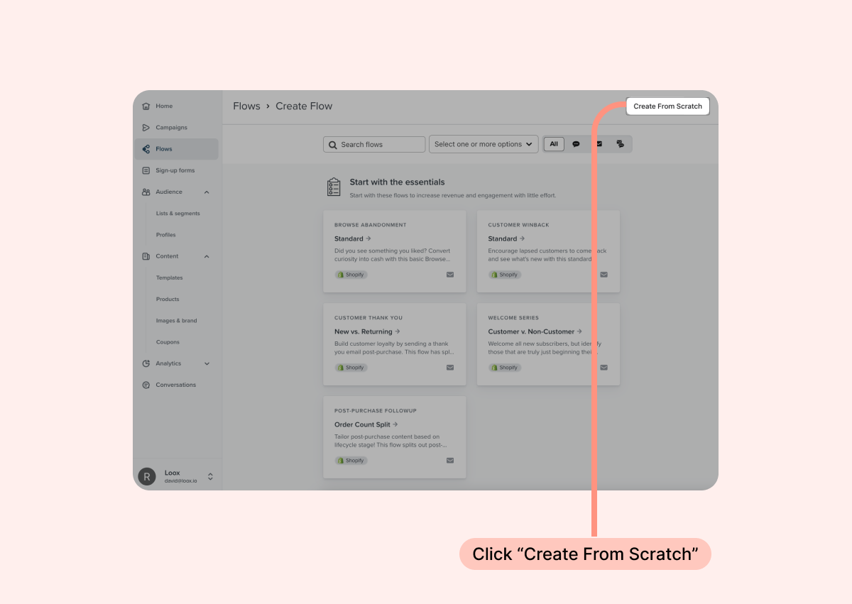 Inside your Klaviyo account’s “Flow” menu, click “Create Flow”: