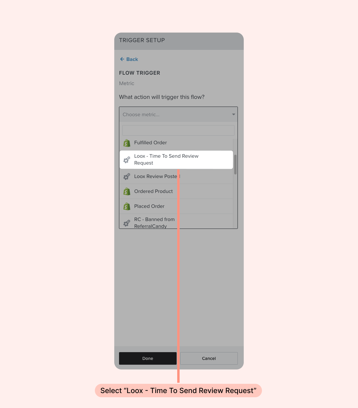 - Select "Loox Review Posted", set up any filters if you wish, and click "Done":