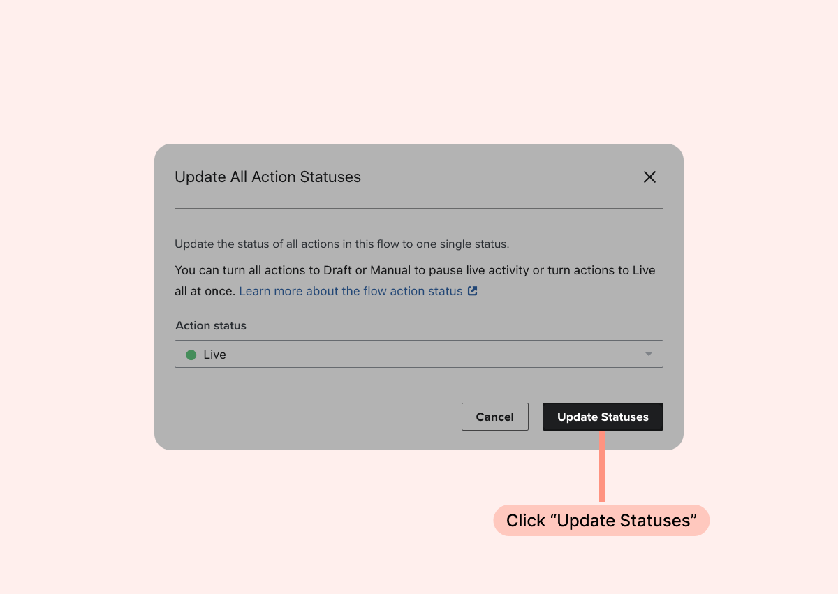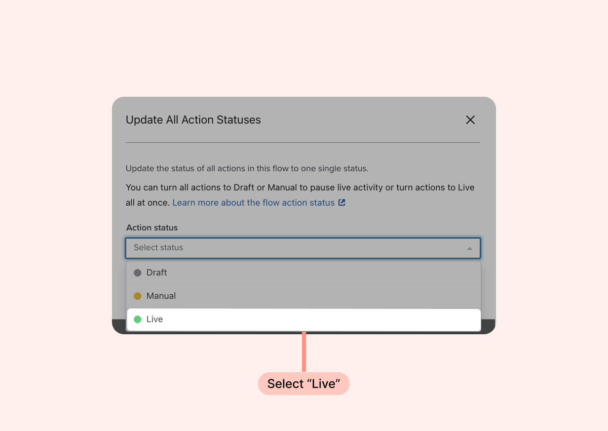 In the “Update All Action Statuses” window, select “Live” from the Action status dropdown menu: