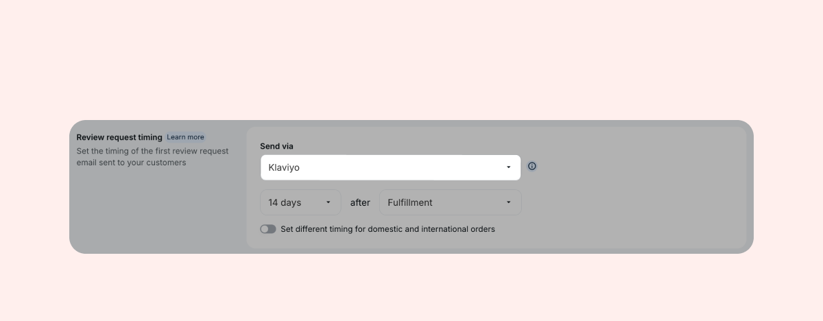 - Under "Review request timing", change your "Send via" email setting to "Klaviyo".