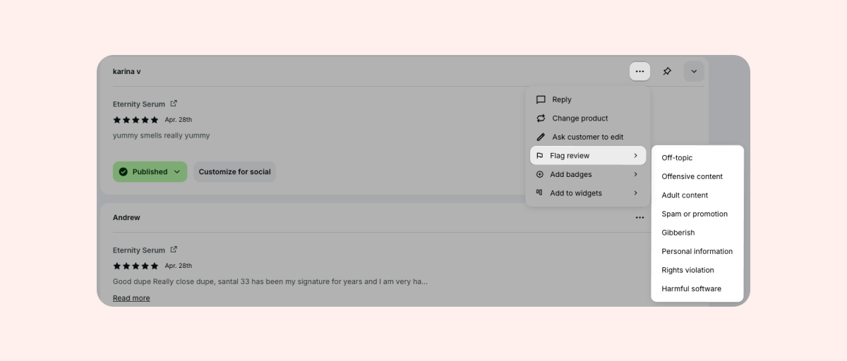 With AI review flagging, you can keep your reviews compliant with local laws and syndication platforms and prevent inappropriate or sensitive content from appearing on your store.