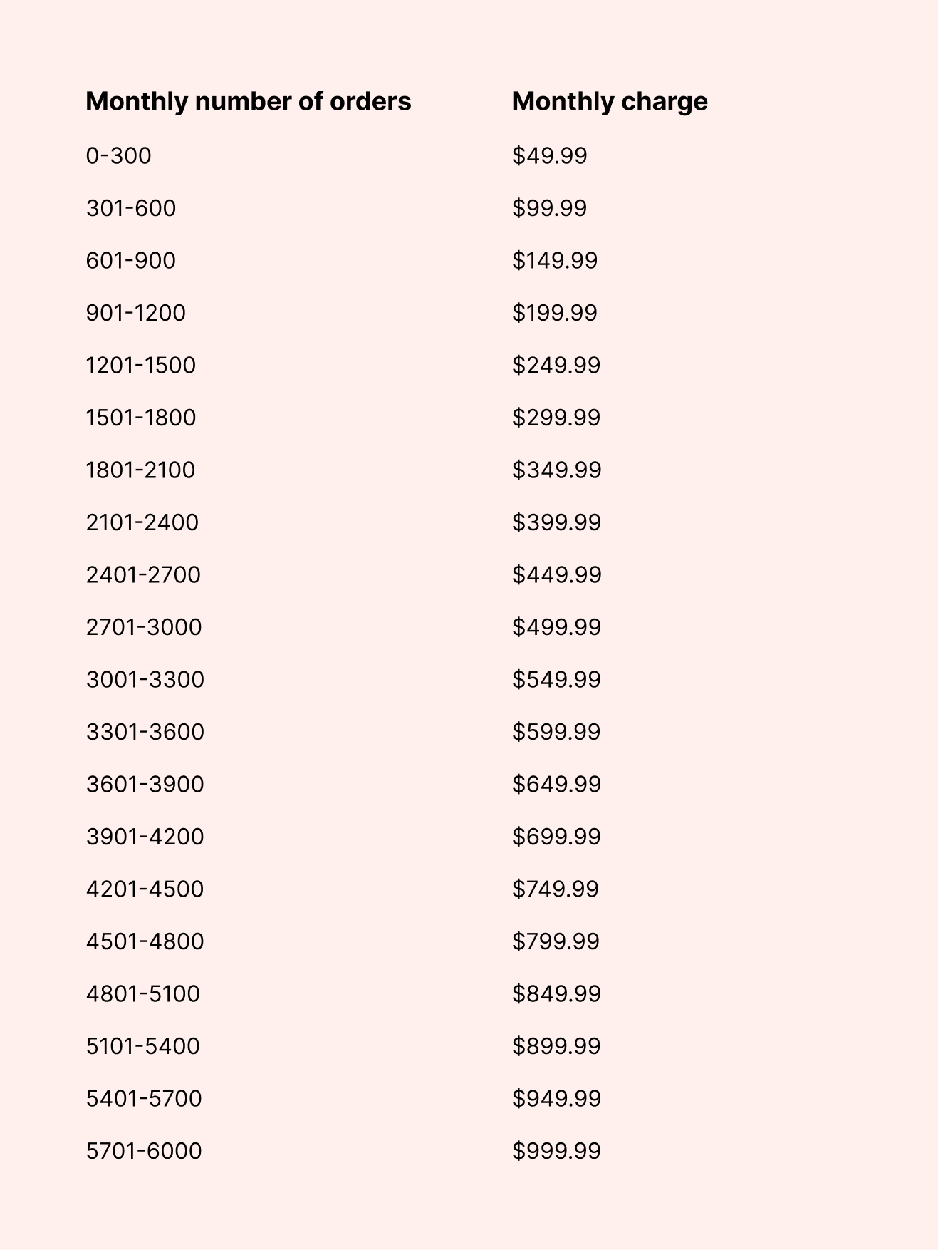 - The maximum charge is $999.99/month (6,000 orders).